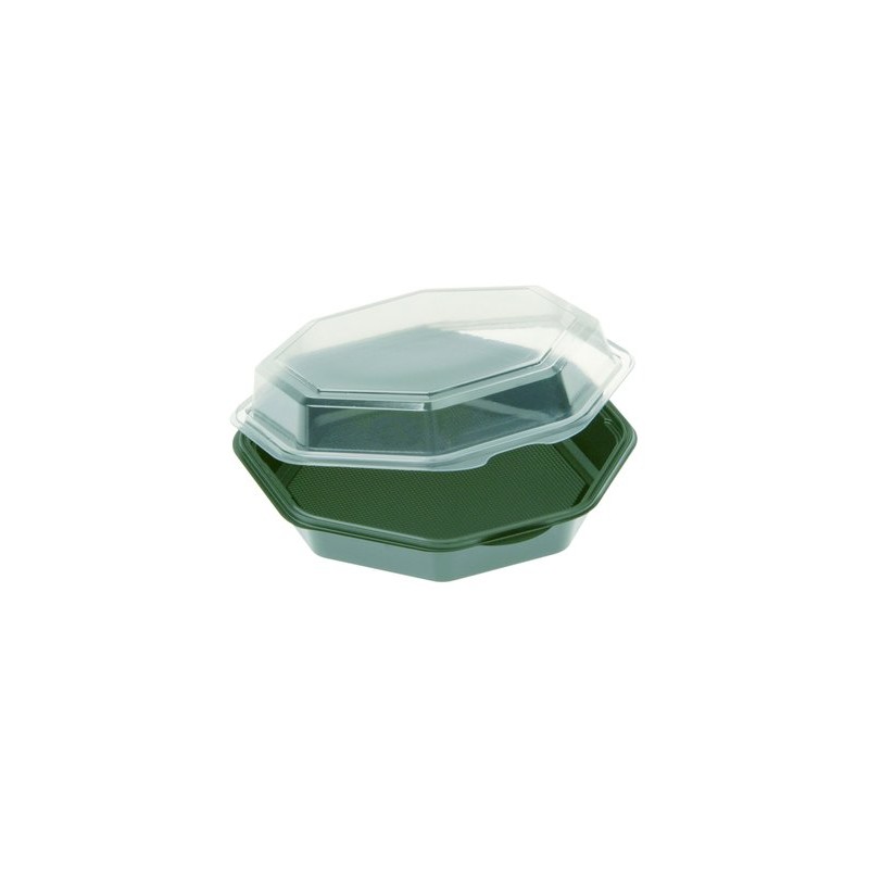 Saladier noir avec couvercle transparent, octogonal. Diamètre 230 mm, Hauteur 80 mm, Contenu 1'350 ml. Carton de 180 pièces.