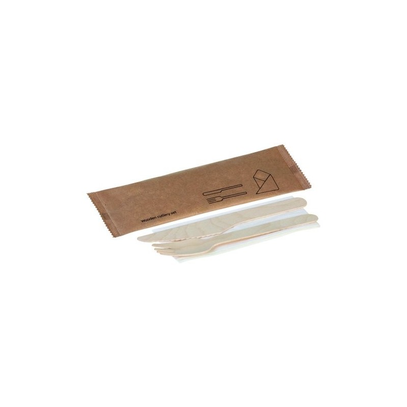 Set de couvert en bois naturel comprenant 1 fourchette, 1 couteau et 1 serviette. Longueur : 16,5 cm. Vendu à la pièce.
